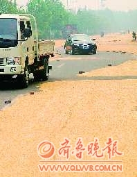 6月16日,在德州市双一路,附近村民在此晒麦子,十几米宽的马路两边全部变成麦场,只留下马路中间2米左右的路面,很多过往车辆不得不在窄窄的路面上缓慢行驶。