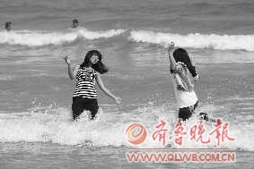 16日,在石老人海水浴场,两名游客穿着衣服直接冲进大海。据介绍,虽然岛城各个浴场还没有开放,但已经有个别市民和游客忍不住,提前下海享受夏日的清凉。 本报记者 杨宁摄影报道