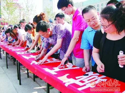 16日,威海市工商局与宣传部、文明办等8部门联合组织开展“百城万店无假货示范街”创建活动,并组织示范街广大业户举行签名承诺仪式,引导其积极参与到活动中来。图为活动现场示范街业户正在承诺条幅上签名。                 本报记者 冯砚农 摄