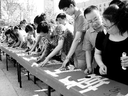 16日,威海市工商局与宣传部、文明办等8部门联合组织开展“百城万店无假货示范街”创建活动,并组织示范街广大业户举行签名承诺仪式,引导其积极参与到活动中来。图为活动现场示范街业户正在承诺条幅上签名。 本报记者 冯砚农 摄