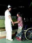 在12楼关节骨科病房外的大厅里,护士长王芳扶着小秋霞一步一步地挪动着脚步,进行腿部锻炼。但锻炼的强度不是很大,小秋霞迈动的步子很小,而且不到半分钟,就要到轮椅上休息一下。在锻炼过程中,小秋霞紧紧抱着王芳的胳膊。小秋霞说,走路的时候很累很酸。