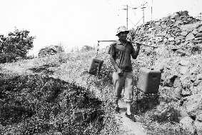 王太军在机井旁接满水后,带着记者去他家的山楂果园。“我们村主要的收入来源就是种植山楂,大家都很着急,但现在已经无水可用了,村里的水库今年春节时就已经干了。”王太军挑着两桶水走在高低起伏的山路上,指着路边干枯见底的水库说。