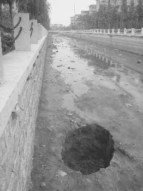 事件:陷泥河河道内突然出现直径2米,深2米的大坑,造成该段河水迅速渗漏,露出河床。