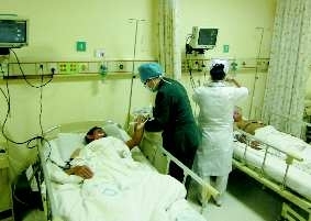 在重症监护内,共躺着李正杰、薛守贤和另外两名工人,医生忙着为他们吸氧气、输液,并为他们用上了心电监护仪。