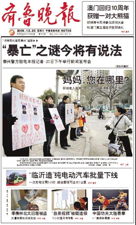 2009年12月19日,聊城市民吴建国、吴保国等兄妹及两个孩子,举着寻母的牌子,站在寒风凛冽的街头,寻找走失的妈妈。本报在12月20日在省版头版刊发《妈妈,你在哪里?》,并在A07版刊发半版图文。