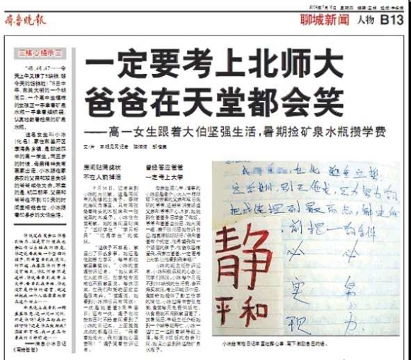 2009年7月16日,本报刊登了《一定要考上北师大爸爸在天堂都会笑》,小冰的故事牵动着聊城市民的心。