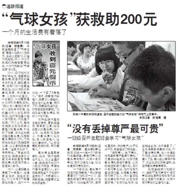 2009年12月17日,本报以《“气球女孩”笑对残疾人生》为题刊发首篇报道,引起广泛关注。2010年9月12日,“气球女孩”打来电话,哭诉说自己收到一张百元假币,她决定交到银行。9月13日本报刊发《残疾女孩收到百元假币要交银行》、9月15日刊发《“气球女孩”把假币交银行》和《很多人帮助过我 我不能拿假币害人》,9月16日本报刊发《“气球女孩”获救助200元》,“气球女孩”葛永清成为了聊城的新闻人物。