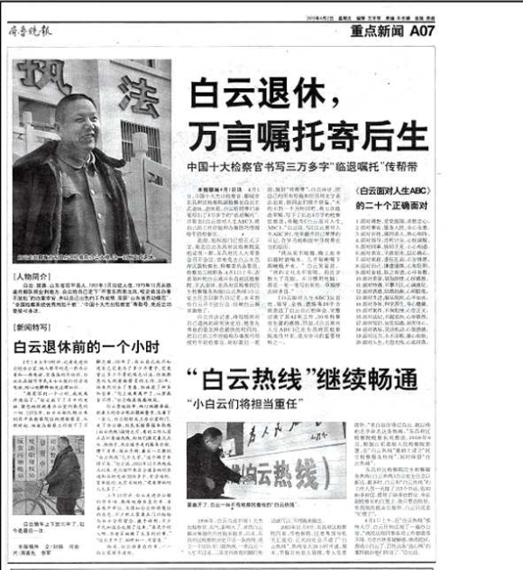 2010年4月1日,中国十大杰出检察官、聊城市东昌府区检察院副检察长白云正式退休。退休前,白云给同事们亲笔写出3万多字的“临退嘱托”,完整记录了其42年工作、30年检察官生涯的感悟。