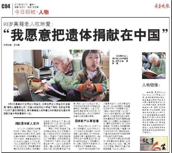 牧琳爱说,她1917年8月出生在河北省北戴河,自那以后就和中国结缘,她常对周围的人说,她生在中国,有一颗中国心,把遗体捐献在中国是她的愿望。