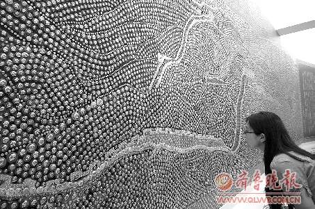上图:一位参观者在欣赏墙上的毛主席像章。新华社发