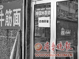 6月19日,在黄河五路上,一家饭馆的玻璃门上贴着“内有空调”。据饭馆老板介绍,这是刚贴上去的,因为天热,有空调才能招来顾客。 本报见习记者 王传宝 摄
