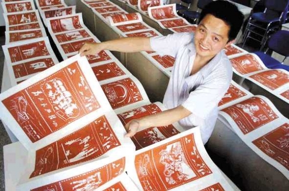 6月17日,黄兴涛展示他剪刻的“党的光辉历程”40米长卷。聊城青年黄兴涛历经一年零三个月,将中国共产党伟大成就创作剪刻出90个单幅、共长40米的剪纸长卷,向党的生日献礼。