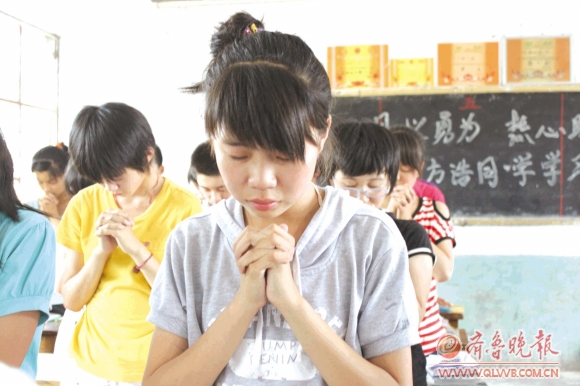 就读于东平县老湖镇中学七年级四班的学生方浩为救落水同学溺水身亡。20日,为悼念见义勇为的方浩和一同溺水的刘彬,他们班召开主题班会,向方浩学习。图为学生默默祈祷。