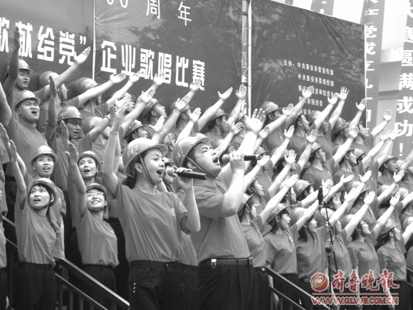 19日下午,由中共泰安市委宣传部等单位主办的“心中的歌献给党”企业歌唱比赛在宝龙城市广场举行,来自全市的8个合唱代表队和6名一等奖个人选手参加了汇报演出。图为企业选手正在激情演唱。本报记者 李虎 摄