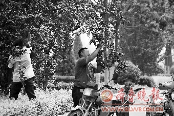 6月20日,德州康博大道路边的果树上缀满果实,经不住诱惑的行人纷纷停车采摘,全然不顾绿化带附近竖立的“已喷农药,请勿入内”的牌子。 本报记者 马志勇 摄