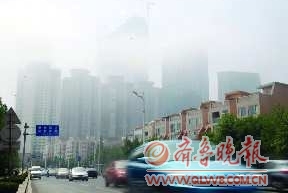 20日,汽车行驶在东海路上,身后成片的楼群被雾气笼罩。当日,前海一线再次起雾。据气象部门消息,未来三天将持续大雾天气,另外,从22日起,青岛将持续多雨天,23日前后全市普降中雨。