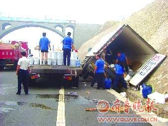 21日10时许,一辆厢式货车行至滨莱高速公路126公里处时,驶入路边沟内。民警询问得知,原来司机开了夜车,一迷糊车驶入了路边沟内。图为事故救援现场。