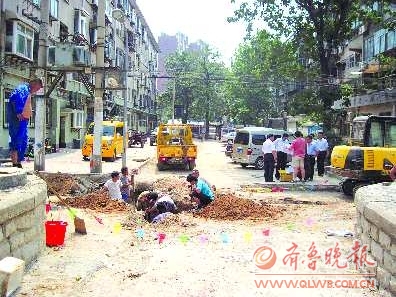 21日下午2点,记者赶到事发的七里山南村5区7号楼旁边时,还能闻到一股浓重的燃气味,几辆写有“济华燃气”的抢修车停放在单元楼旁,路边坑道内多名工人正在紧张工作,施工坑外,几名男子正在商量着什么,还不时拿出图纸来比划一下。