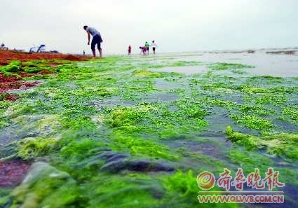 继在刘家湾赶海园景区登陆后,6月21日下午浒苔开始出现在万平口景区。被打捞上来的浒苔堆积在沙滩上,从南到北绵延有几公里长。