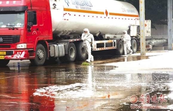 17日上午10点钟,记者来到泰安深燃液化天然气利用有限公司。在装车区,装车人员仇锐正在装车泵旁观察装车泵是否正常运行。突然记者听到了呼救声,此时装车台里冒出很多黄色的烟雾,一股刺鼻的气味立即扑面而来,一名司机瘫倒在地,其余司机一起将受伤司机抬到了安全地点。仇锐检查发现,原来是液化天然气槽车法兰螺丝连接处大量泄漏,司机的腿部被液化天然气液体冻伤。