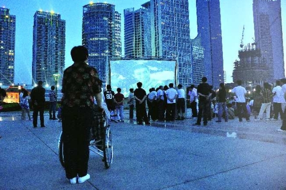 20日晚,在烟台滨海广场,市民正在观看“红色影片”。进入夏季以来,滨海广场游人明显增多,烟台市开始在广场开展“红色影片放映月”活动。活动前后将历时一个月,每天19:30放映《英雄儿女》、《开国大典》、《南征北战》等30余部经典红色影片,为市民游客奉献上一场场精彩的精神文化盛宴。本报记者 赵金阳 通讯员 宋大伟 摄