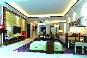 电视背景墙的中式红胡桃木外框结合米黄色工艺砖,让现代时尚与中国古典元素结合,显得大气整体。沙发背景以带凹凸面的砂岩为装饰元素,排列有序,富有现代节奏感。全屋少许中式家具及中式窗格的使用让整个空间中式风格得到升华。