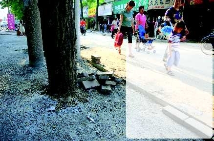 施工人员说,现在是铺设地面初期,因此大树周边的地方可能会有一些水泥,但在地面铺设的时候会给每棵树都留出足够的空隙,而且树根周围的水泥会清理干净。