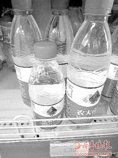 本报菏泽6月21讯(见习记者 崔如坤) 21日,市民王先生反映,他在菏泽某连锁超市买了大小两瓶农夫山泉纯净水,价格竟然—样,感觉很不理解。 21日上午,市民王先生向本报反映,他在中华路上的某连锁超市买了大小两瓶农夫山泉纯净水,大瓶净含量为550ml,小瓶净含量为380ml,两瓶相差170ml。价格均为1.3元,怎么价格就—样呢?王先生感觉很纳闷。“产地—样,水的特性也—样,小瓶的怎么也得比大瓶的便宜点吧?”王先生说。 根据王先生反映的情况。21下午,记者走访了三信、惠和和银座三家超市、商场了解到,三信超市、惠和商厦和银座所售的550ml和380ml装的农夫山泉纯净水定价均为1.3元。在银座550ml装的农夫山泉纯净水正在促销,价格竟然比380ml装的还便宜0.2元,售价为1.1元。三信的—售货员表示,“从—开始定价就—样。至于为什么—样,我也不清楚。”