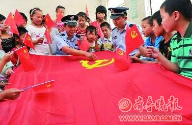 6月21日,定陶县公安局陈集派出所民警正在向辖区中心小学的孩子们介绍党旗、党徽知识。今年是中国共产党成立90周年,定陶县公安局组织开展“纪念中国共产党成立90周年”系列主题教育活动,通过唱红歌、跳舞蹈、讲故事等形式,对孩子们进行革命传统和理想信念教育。 本报通讯员 朱建英 摄