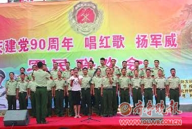 6月20日下午,“唱红歌、扬军威”军民联欢会在菏泽单县消防大队隆重举行。为庆祝建党90周年,单县公安消防大队和单县师范联合举办此次活动。消防队官兵及师范学校师生共同演唱红歌外,单县公安消防大队官兵还表演了消防战斗服时装秀。