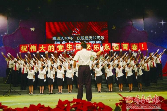 6月21日晚,由中共菏泽市委市直机关工委主办的“联通沃3G杯”庆祝建党90周年经典红歌大家唱决赛在菏泽电视台演播大厅拉开帷幕,经过2个多小时的角逐,菏泽学院最终以一曲《祖国颂》摘得桂冠。 本报见习记者 邓兴宇 摄