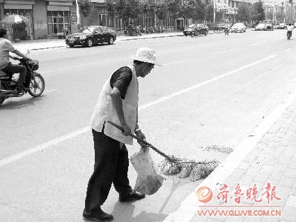 中午十一点,在渤海九路,路边的树荫下坐了不少纳凉的人。环卫工李老汉正拿着笤帚清扫路面上的垃圾,李老汉表示他也没有听说过高温补贴这回事,“不过单位每年都会发一些仁丹丸之类的解暑药,还会发一斤茶叶。”在另外一条路上工作的一位环卫工说:“2009年之前夏季的几个月每个月会有20元的补贴,2009年我们的工资涨到500元/月后就没有再发过,夏天的时候会发两盒防暑药水、风油精之类的东西。”这位环卫工说,他从早上5:00到晚上8:00大部分时间都在马路边盯着,有垃圾就清理,自己带的水喝完了,就到街边一些单位或商铺里去要点水喝。