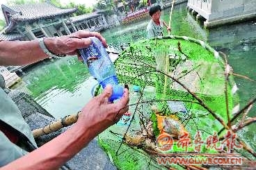22日,几名保洁员驾船在趵突泉公园里打捞水面漂浮物和水底的垃圾。如今虽然在景区乱丢垃圾的陋习比以前有了明显减少,仍有少数缺乏公德心的游人我行我素。 本报记者 陈文进 摄