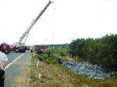 本报热线6610123消息(记者 鞠平 通讯员 姜丽媛) 一辆大货车在国道上跑得好好的,突然刹车失灵发生侧翻,更不幸的是它翻进了路边的积水沟。6月22日下午,栖霞消防调来一辆拖车将大货车头部吊出,随后将被困司机救出。