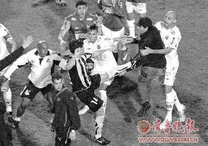 当地时间6月22日,南美解放者杯足球赛决赛次回合比赛中,巴西桑托斯队主场以2:1战胜乌拉圭佩纳罗尔队,夺得本队48年来首座冠军奖杯。赛后,按捺不住火气的双方队员大打出手。 新华社发