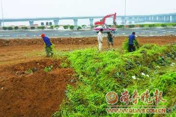 23日,在即将通车的胶州湾大桥上,工人正在对沿路的区域进行绿化,为6月30日正式通车做最后的准备。