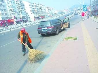 作品描述:为防止空气中的污染物,环保工人头戴方便袋。