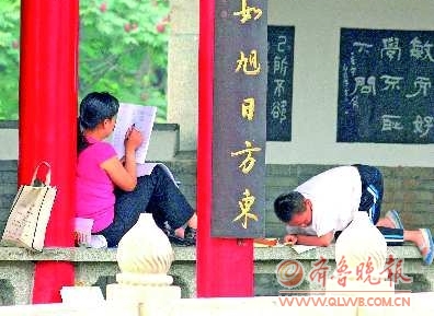 自述:母子俩在公园廊亭的石凳上各学各的,精神可嘉,