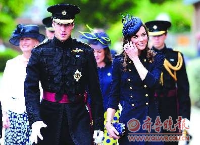 妻子凯特·米德尔顿身着藏蓝色海军制服外衣,胸前别有从爱尔兰卫队借来的金色三叶草胸针。这是米德尔顿首次以王室成员身份出席以军事为主题的活动,也是威廉王子在2011年2月被任命为爱尔兰卫队上校后首次会见爱尔兰卫队士兵。