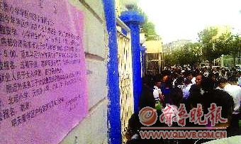 下午5时许,记者在学校门口看到了一张关于报名的通知。这份学校当天下午4时左右贴出的通知称:“目前学区内部分济南市市民子女仍未按时报名,报名时间截止到今天下午5时。望本学区内学生家长在下午5时之前务必带学生到学校报名,过期不候。”