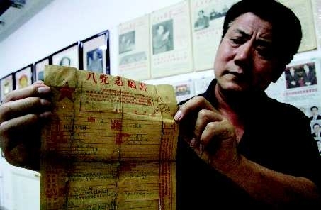 26日,来自30位收藏者的3000余种珍贵藏品亮相纪念建党90周年潍坊市大型红色收藏展。展品中有现存世极少的1926年上海亚东图书馆出版发行四册《独秀文存》,以及抗美援朝战地笔记。为方便市民参观,此次展览将持续到7月2日。图为潍坊藏友刘广顺展示自己收藏的一张1946年的入党申请书。 本报记者 吴凡 摄影报道
