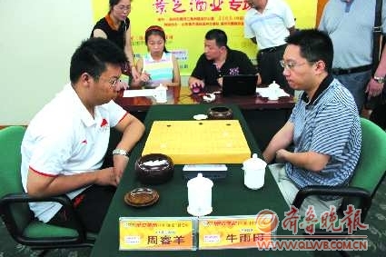 25日,“2011金立手机杯中国围棋甲级联赛山东‘景芝酒业队对广西华蓝队景芝酒业专场现在开始’。”一声令下,三场角逐立即展开,小将五段崔灿刚刚开局就遭遇打劫,一直苦战,中途离场休息十分钟,回来后继续对战,可是最后无能转机。山东队小将江维杰对战王磊一场中,开局也是出师不利,幸好在中盘时王磊打了几次缓手,江维杰趁机找到了转机,王磊不甘示弱,托住脑袋长时间思考,最长一次长达十分钟。尽管如此,江维杰很好地把握住转机,最后逼得王磊停钟认负。周睿羊主将在对抗牛雨田的比赛中,状态较好,不过也是煞费苦心。记者在现场看到周睿羊时不时地把棋子拿在手中,另一只手托着腮帮在苦力思考,一直没有给对方机会,顺利赢得比赛。