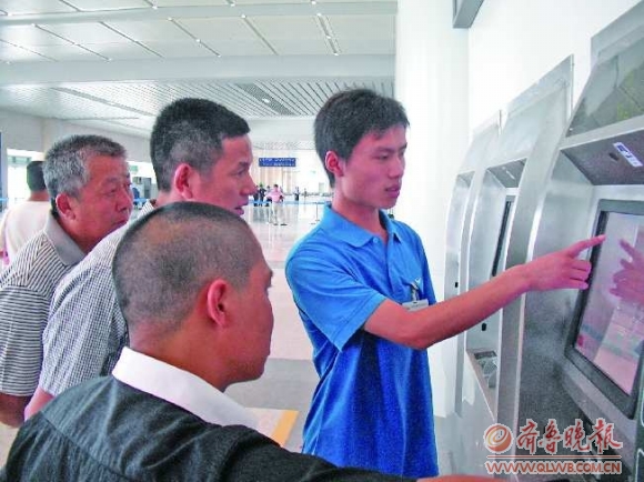 27日,京沪高铁通车在即,济南西站站房内的候车坐椅、安检仪、自动售票机等设施基本到位。志愿者也已经进站,为前来买票的乘客提供服务。在自动售票机前,青年志愿者正在为市民讲解购票方法。 本报记者 王光照 赵丽 摄影报道