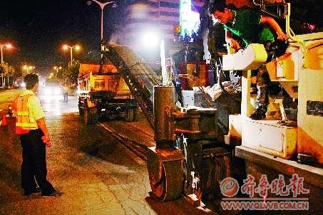 6月26日深夜,当大部分市民进入梦乡的时候,市政工作人员在湖滨大道上忙碌着,趁着深夜车少之时,对受损路面进行抢修,先将损坏路面进行刮除,再重新铺设沥青。