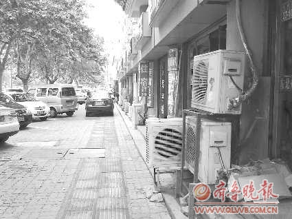 27日,记者经过新威路看到,路边不少商铺都将空调外机装在店门口旁边,位置高矮不一,大多是“席地而坐”,有的两三个叠在一起,有的向外延到人行道上。路边一店铺女子说,早上还有一辆车与空调外机碰了。