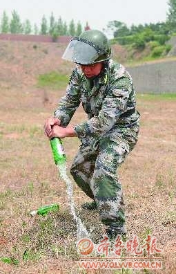 6月23日,位于山海天度假区的日照市民兵训练基地比武场上口号震天,来自日照军分区的46名优秀基层武装部长、民兵教练员和8名现役干部,在12项军事课目比武中展开激烈角逐,全面检验了日照市国防后备力量执行多样化军事任务的能力。图为民兵教练员展示硬气功。