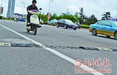 6月26日,泰安路与烟台路交叉路口东侧,一处马路减速带上的橡胶少了一块,里面的铁钉露了出来。 本报记者 张永斌 摄