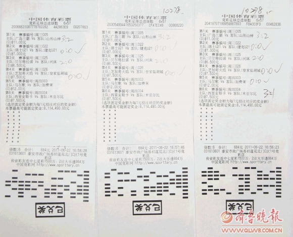 6月22日,泰安彩友李强(化名)投注竞彩足球总进球数游戏,以6串57的方式投注,虽猜错其中3场,仍中得奖金30834元。