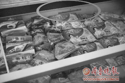 27日上午,在市中区君山路某超市记者看到,六个大型的敞口冷柜中,堆满了水饺、汤圆、丸子、粽子等速冻食品。其中三个冷柜内放置的速冻食品超过了“食品整理线”,记者在扒开上层的食品后,才能看见冰柜口下方的“食品整理线”,有些速冻食品下面还垫着装有速冻食品的包装箱。
