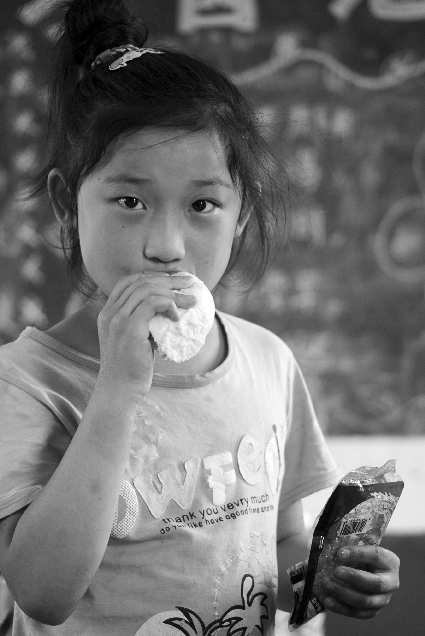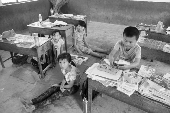 27日上午11时45分,记者再次来到费县梁邱镇卧虎联小。在教室外的台阶上,孩子们正围在一起吃午饭。家住北王家庄村正在读学前班的李善梅,一手拿着馒头,一手拿着辣条,一口一口地吃着。李善梅的姐姐告诉记者,她上六年级,每天带着妹妹上下学,中午就在教室里吃饭、休息,她们班26个学生,有6个家住北王家庄村的,吃完午饭后,她们就在教室的地上铺一个塑料编织袋,躺下休息一会。